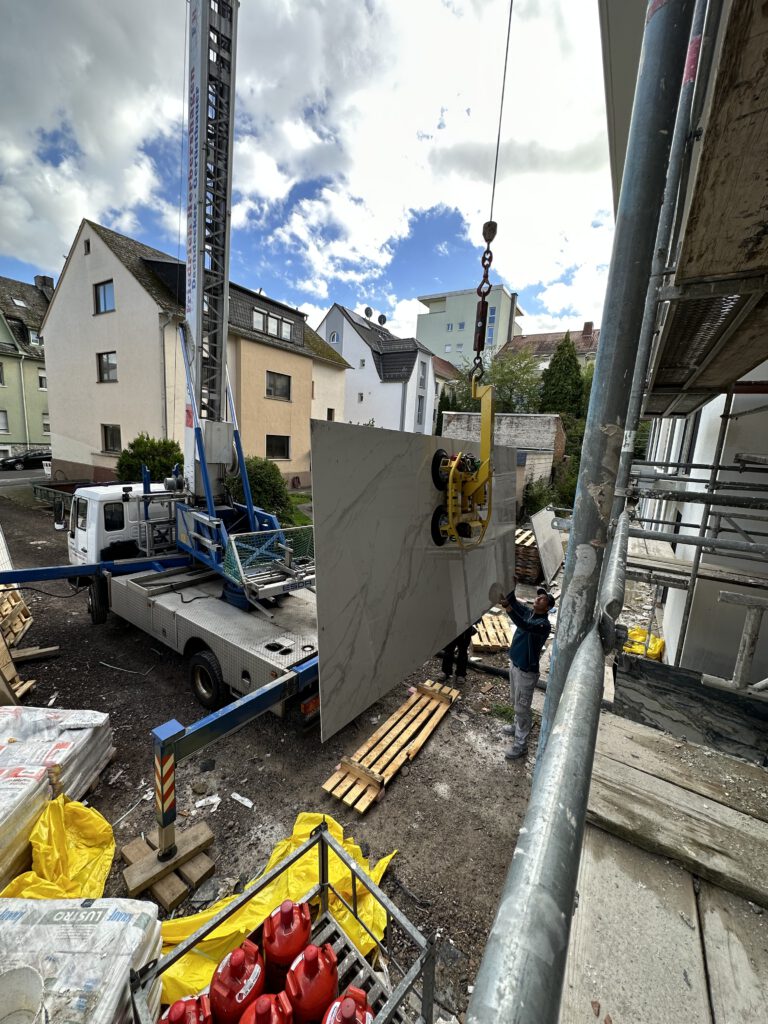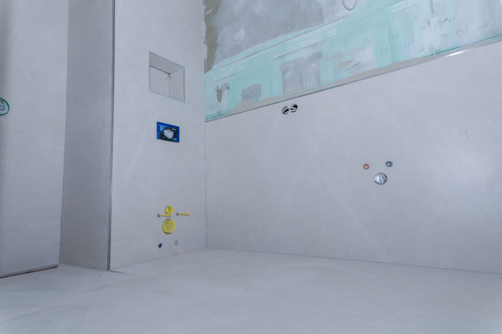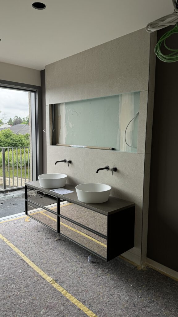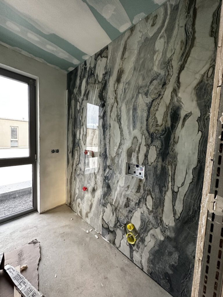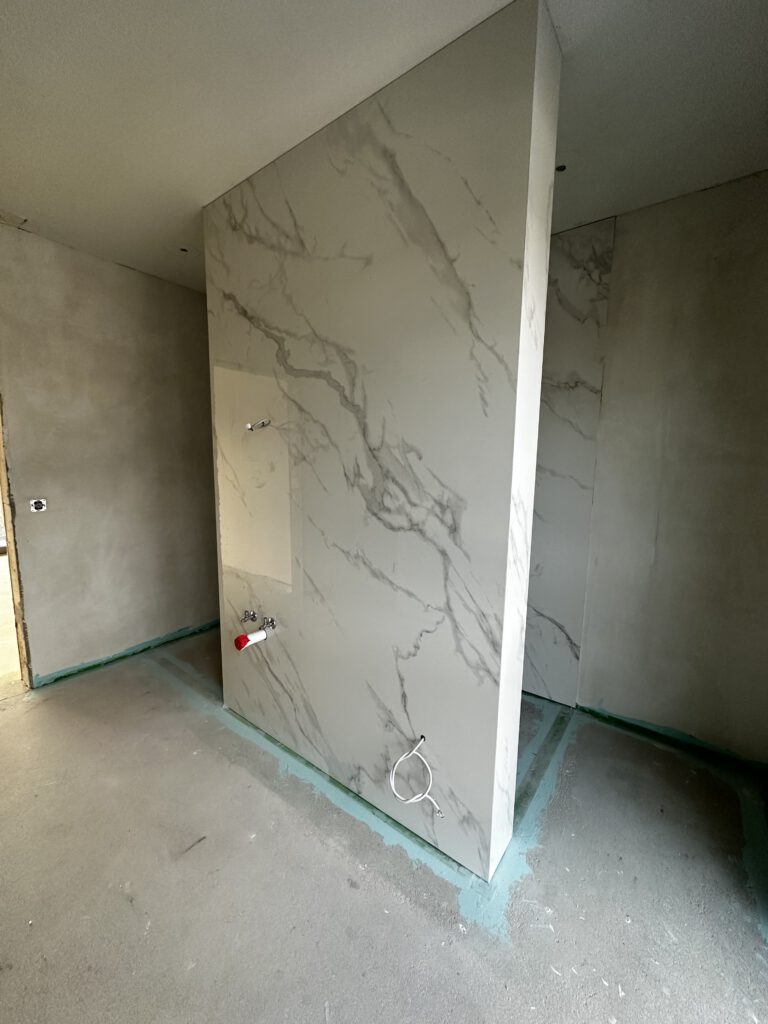 Im Penthouse-Projekt Limburg Müller wurden großformatige Fliesen in Marmoroptik verwendet, um ein luxuriöses und modernes Ambiente zu schaffen. Die Installation dieser großformatigen Platten erforderte Präzision und spezielle Techniken, um die beeindruckenden, fast nahtlosen Oberflächen zu erzielen. Diese Fliesen bieten nicht nur eine ästhetisch ansprechende Optik, sondern sind auch pflegeleicht und langlebig, was sie ideal für den Einsatz in hoch frequentierten Bereichen wie Bädern und Küchen macht. Die elegante Marmoroptik verleiht den Räumen eine exklusive Atmosphäre und unterstreicht den hochwertigen Charakter des Penthouses.​